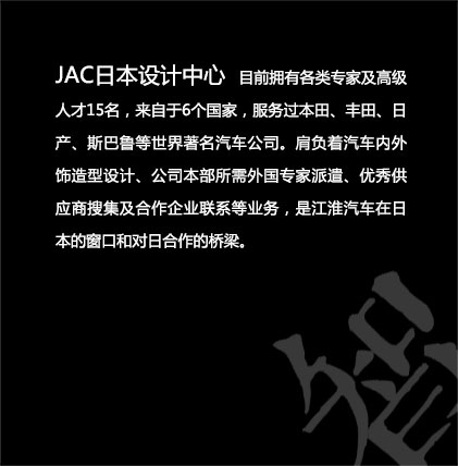 JAC日本设计中心 成立于2006年11月5日,是江淮汽车投资设立的独立设计中心。中心坐落于日本东京——世界上人口最多的城市之一,也是日本的政治、文化中心。同时,它还是日产、三菱和五十铃的所在地,是世界十大汽车城之一。这里有着全球先进的汽车设计理念、人才体系以及供应商资源。